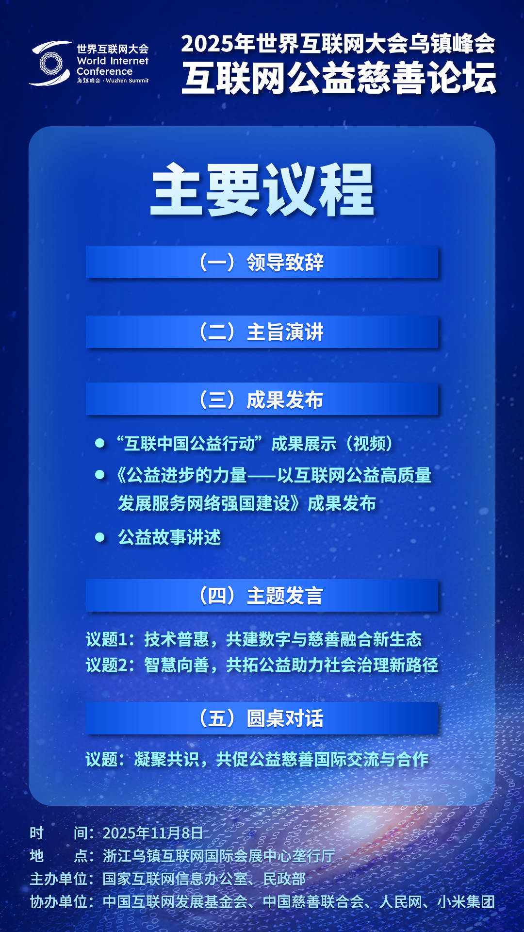 东说念主民网乌镇11月7日电 (记者王金雪、赵竹青)2025年寰宇互联网大会乌镇峰会互联网公益慈善论坛将于11月8日上昼在浙江乌镇互联网海外会展中心垄行厅举行。本次论坛由国度互联网信息办公室、民政部主持,中国互联网发展基金会、中国慈善辘集会、东说念主民网、小米集团协办。