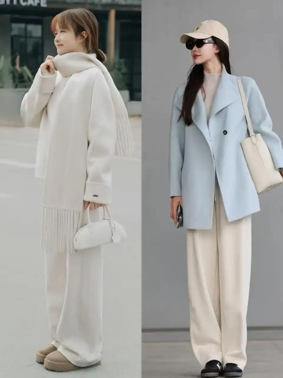 Tips③:雾霾蓝短大衣搭配白色阔腿裤