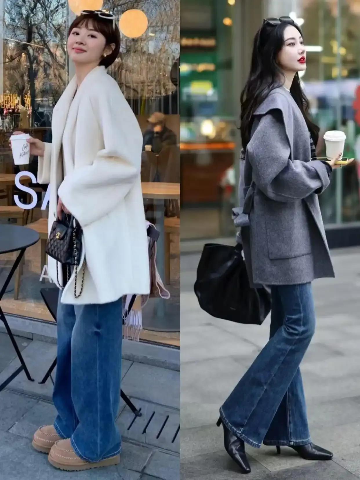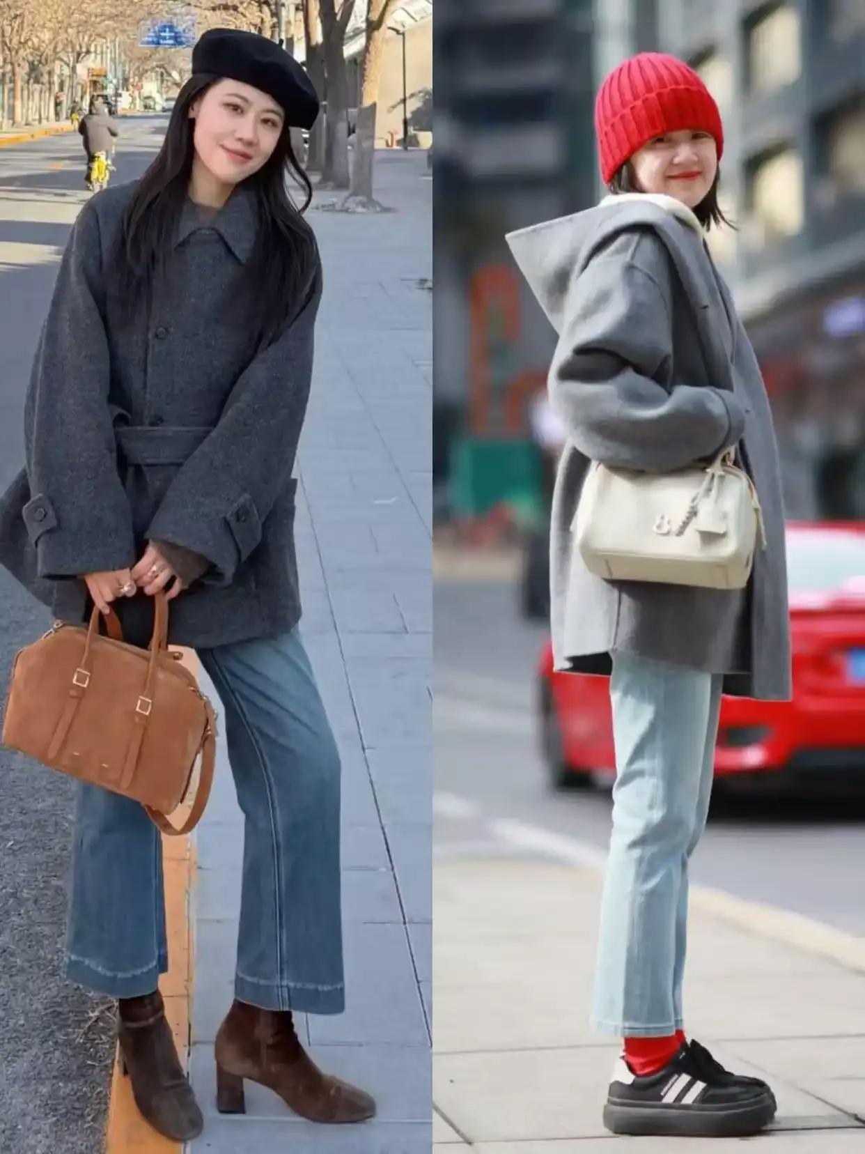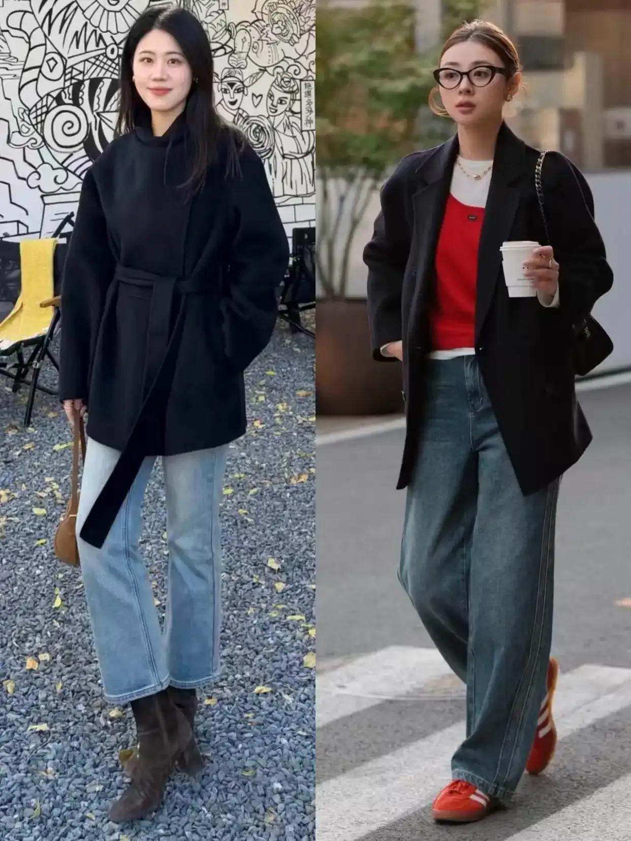 第三章节,短大衣更容易让小个子呈现出大长腿Tips①:玄色大衣搭配牛仔裤