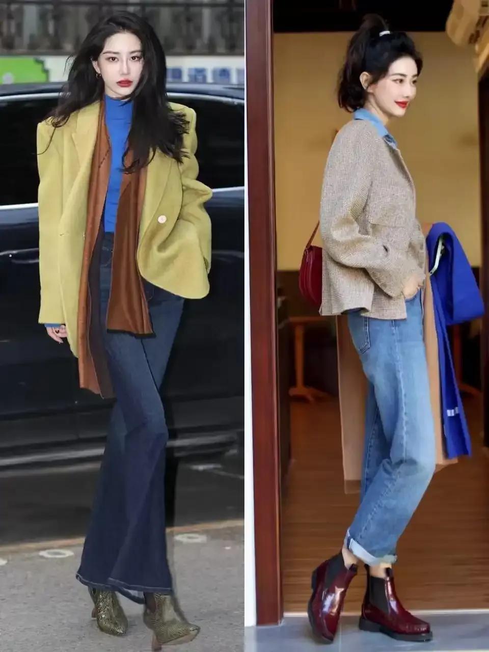 咱们还不如径直采选蓝色的牛仔开叉直筒长裤,脚穿驼色短靴,加上驼色大衣外衣,就能让你 get 到前卫的良好感。